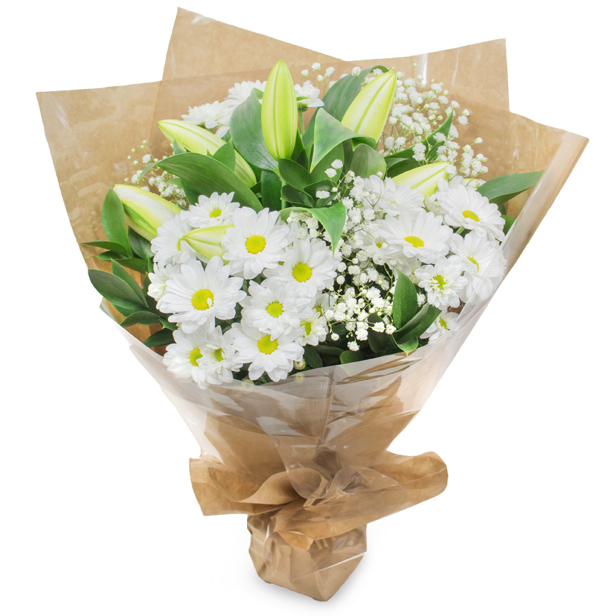 Illuminate any occasion with our radiant white bouquet, featuring snow white lilies, elegant white spray chrysanthemums, and soft gypsophila. Its stunning design makes it a perfect gift to express your love and appreciation.