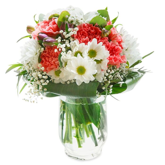 Brimming with the spirit of East Finchley, this lively bouquet features coral and red carnations, each one swirling with luxuriously ruffled petals that seem to dance in the gentle daylight-capturing the energy found along High Road and its hidden gardens. Sparkling white daisies, with lime-tinged yellow centers, offer a joyful lift. Airy clouds of baby's breath wind between the bold colours, suggesting innocence and delight, while glossy dark green leaves flutter at the base like a protective cradle. Clustered to one side are a few closed buds touched with lavender, their promise of blossoming echoing the subtle changes of seasons in local parks. Collected in a pristine square white gift bag with smooth ribbon handles, this arrangement is equally suited to celebrations, milestones, or heartfelt surprises delivered to any doorstep from East End Road to residential lanes. The bouquet feels uplifting, inviting, and sincere-a flourish of expert floristry that speaks to the happy moments and quiet beauty of community life in East Finchley. A celebration of seasonal beauty in East Finchley, this bouquet offers a spirited mix of colour, texture, and fragrant freshness, designed for the moments that matter. Dominant white daisies with lively green centers emerge from within a sea of coral-pink carnations, their ruffled petals and full-bodied shapes adding layers of cheerful exuberance. Wisps of gypsophila dance between the blooms, creating a sense of lightness and movement akin to the breezy mornings at Alexandra Park. Each stem is nestled within a supportive base of mixed greenery-matte silvery eucalyptus and deeper green sprigs framing the circle with natural elegance. Alstroemeria buds, their tips tinged with purple and pink, peek playfully between the petals, promising future blossoms as vibrant as any spring day along East End Road. The clean white backdrop accentuates every detail, allowing the expert design and fresh hues to captivate and delight. This arrangement, created by local East Finchley florists, embodies the community's warmth and is ideal for same-day delivery to mark a birthday, celebrate friendship, or simply bring a smile to a loved one's face in this lively north London neighbourhood. A burst of cheerful colour and gentle sophistication, this bouquet seems to channel the fresh optimism of an East Finchley morning. At centre stage, coral-pink carnations unfurl lush, rippled petals, their texture inviting a lingering gaze-just as local gardens entice a passer-by near The Bishops Avenue. White chrysanthemums and daisy-like blooms open bright faces, each centre touched with green, lending purity and playful charm reminiscent of spring picnics in Cherry Tree Wood. Woven between these main flowers, threads of baby's breath impart soft lightness, as if holding the design in a delicate embrace. Rising to one side, a handful of unopened magenta alstroemeria buds hint at blooms yet to come-an invitation to hope and unfolding delight. The arrangement is bordered by deep green foliage, both glossy and slender, offering depth and balancing the bouquet's exuberance. Held together in a sleek glass vase, the submerged stems and clear water speak of freshness, best enjoyed in homes and offices across East Finchley. Gentle, even lighting against a white background assures every hue and contour stands out crisply, radiating positivity. This is the kind of bouquet ideal for celebrating new beginnings, thanking a helpful neighbour, or brightening a quiet afternoon in N2-expertly crafted and reliably delivered by your trusted local florists.